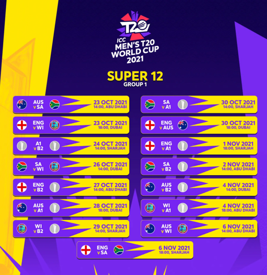 सुपर १२ को ग्रुप वानमा अष्ट्रेलिया, साउथ अफ्रिका, इंग्ल्याण्ड र वेष्टइन्डिज छन् । यस्तै ग्रुप २ मा भारत, पाकिस्तान, न्युजिल्याण्ड र अफगानिस्तान छन् ।