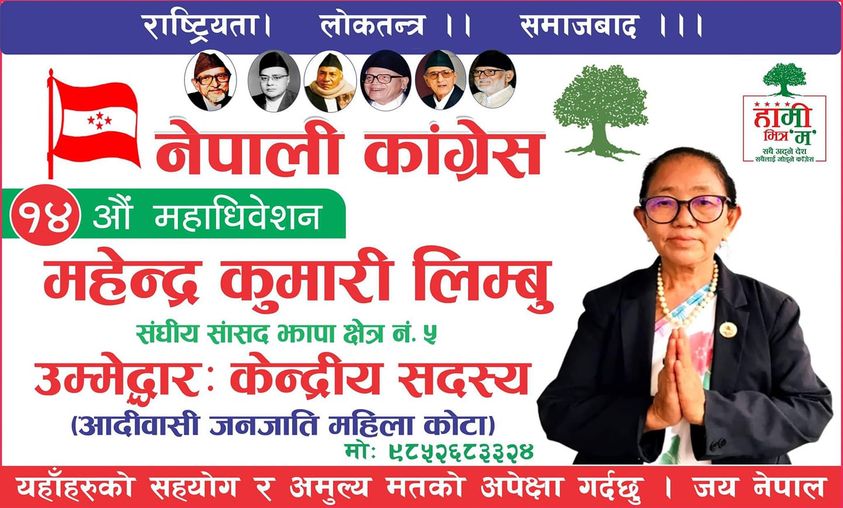 काठमाडौं । माननीय सांसद तथा कांग्रेस नेतृ महेन्द्र कुमारी लिम्बुले नेपाली कांग्रेसको काठमाडौंमा हुने १४ महाधिवेशनमा आदिवासी जनजाति महिला कोटामा केन्द्रिय सदस्यको उम्मेदवारी दिने घोषणा गर्नुभएको छ । सांसद लिम्बु हालै सम्मन्न नेपाली कांग्रेस झापा क्षेत्र नं ५ को अधिवेशनबाट लोकप्रिय मत ल्याई केन्द्रिय महाधिवेशन प्रतिनिधिमा निर्वाचित हुनुभएको थियो ।