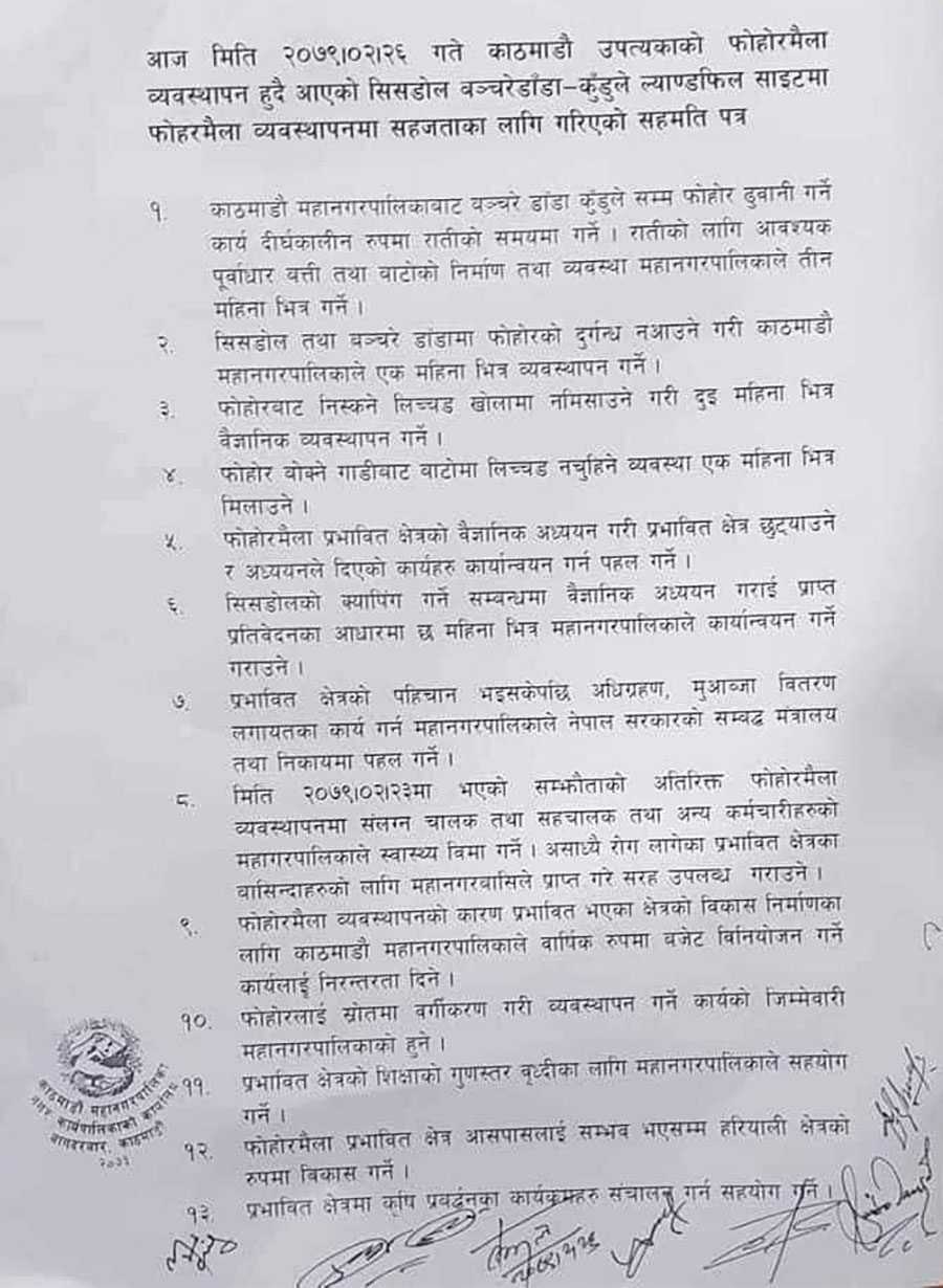 सिसडोल तथा बन्चरे डाँडामा फोहोरको दुर्गन्ध नआउने गरी काठमाडौं महानगरपालिकाले एक महिनाभित्र व्यवस्थापन गर्ने, फोहोरबाट निस्कने लिच्चड खोलामा नमिसाउने गरी दुई महिनाभित्र वैज्ञानिक व्यवस्थापन गर्ने, फोहोर बोक्ने गाडीबाट बाटोमा लिच्चड नचुहिने व्यवस्था एक महिनाभित्र मिलाउने लगायतका सहमति पनि भएको छ ।