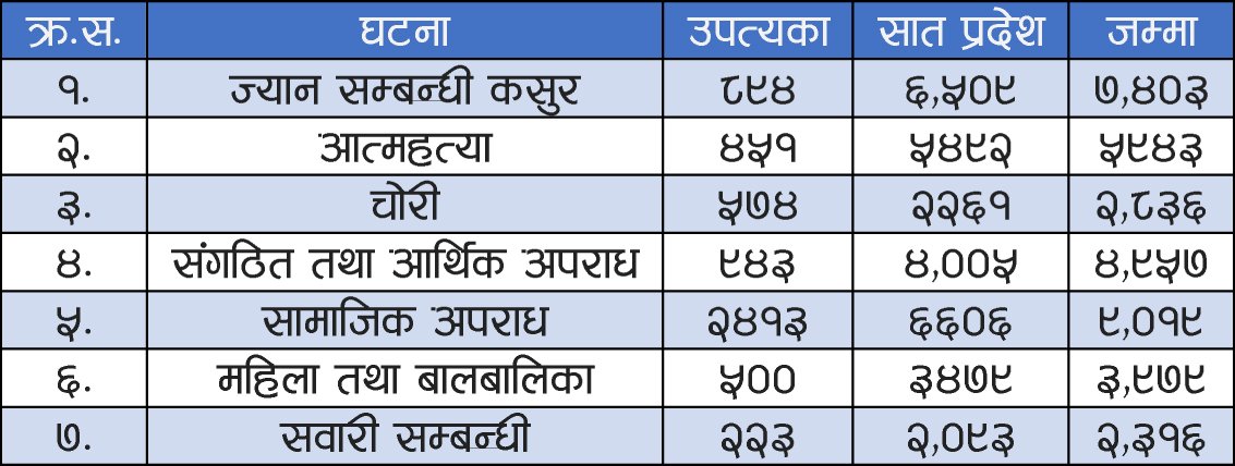 सो अवधिमा ९६२ वटा ज्यान मार्ने उद्योगका घटना भएका छन् । भवितव्यमा परेर ४ हजार १५२ जनाले ज्यान गुमाएका छन् । गत वर्ष साउनदेखि जेठसम्म एक हजार ५२२ वटा फुटकर ज्यान सम्बन्धी घटना भएका छन् । बेवारिसे अवस्थामा भेटिएका र पहिचान नखुलेका घटनालाई प्रहरीले फुटकर ज्यान सम्बन्धी घटना भन्ने गरेको छ । ११ महिनामा प्रहरीले गर्भ संरक्षणविरुद्ध कसुर गर्ने ३३ जनालाई मुद्दा चलाएको छ ।