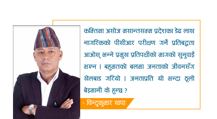 प्रदेशसभा नियमावलीको नियम ८५ को १ अनुरूपको संकल्प प्रस्तावमा ‘एक घर, एक पीसीआर’ टेष्टको व्यवस्था, विश्व स्वास्थ्य संगठन र नेपाल सरकारले तय गरेको मापदण्ड अनुसारको क्वारेन्टिन, स्वास्थ्यकर्मी, भेन्टिलेटर लगायतका आवश्यक स्वास्थ्य उपकरणयुक्त आईसीयू र आइसोलेसन कक्षको व्यवस्था गर्नुपर्ने माग प्रमुख रहेका थिए । जनताको जीवनभन्दा ठूलो कुरा केही हैन । प्रस्तावप्रति कांग्रेस लचिलो र जिम्मेवार थियो तर प्रस्ताव पेश भएको एक महिनासम्म सदनलाई अनिर्णयको बन्दीजस्तै बनाइयो । कम्तिमा असोज मसान्तसम्म प्रदेशका डेढ लाख नागरिकको पीसीआर परीक्षण गर्ने प्रतिवद्धता आओस् भन्ने प्रमुख प्रतिपक्षीको मागको सुनुवाई भएन । बहुमतको बलमा जनताको जीवनसँग खेलबाड गरियो । जनताप्रति यो भन्दा ठूलो बेइमानी के हुन्छ ?