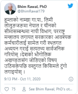 ‘नेपाल र चीनको सीमासम्बन्धमा नापी विभाग, परराष्ट्र मन्त्रालय लगायत सरकारका आवश्यक कर्मचारीलाई सामेल गरी स्थलगत अध्ययन गराई सत्यतथ्य सार्वजनिक गरियोस्,’ रावलले भनेका छन् । देशको भौगोलिक अखण्डतासँग जोडिएको विषय उठिसकेपछि वस्तुगत किसिमले टुंगो लगाउनुपर्ने रावलको माग छ ।